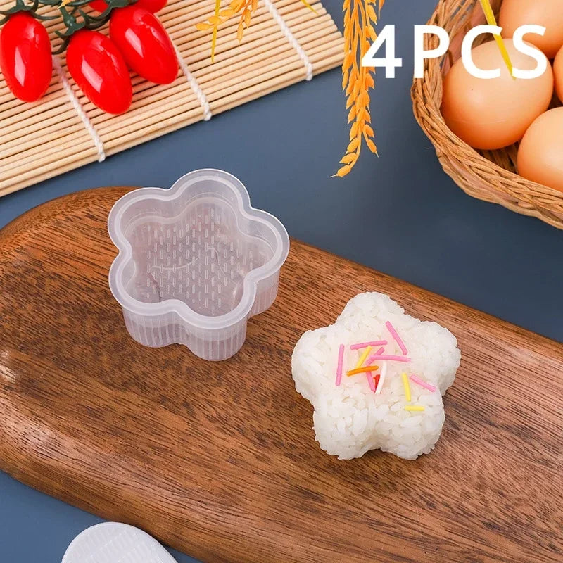 Overview: Set of four transparent triangular molds to shape onigiri rice balls and bento rolls; simple to use for home sushi preparation and meal prep