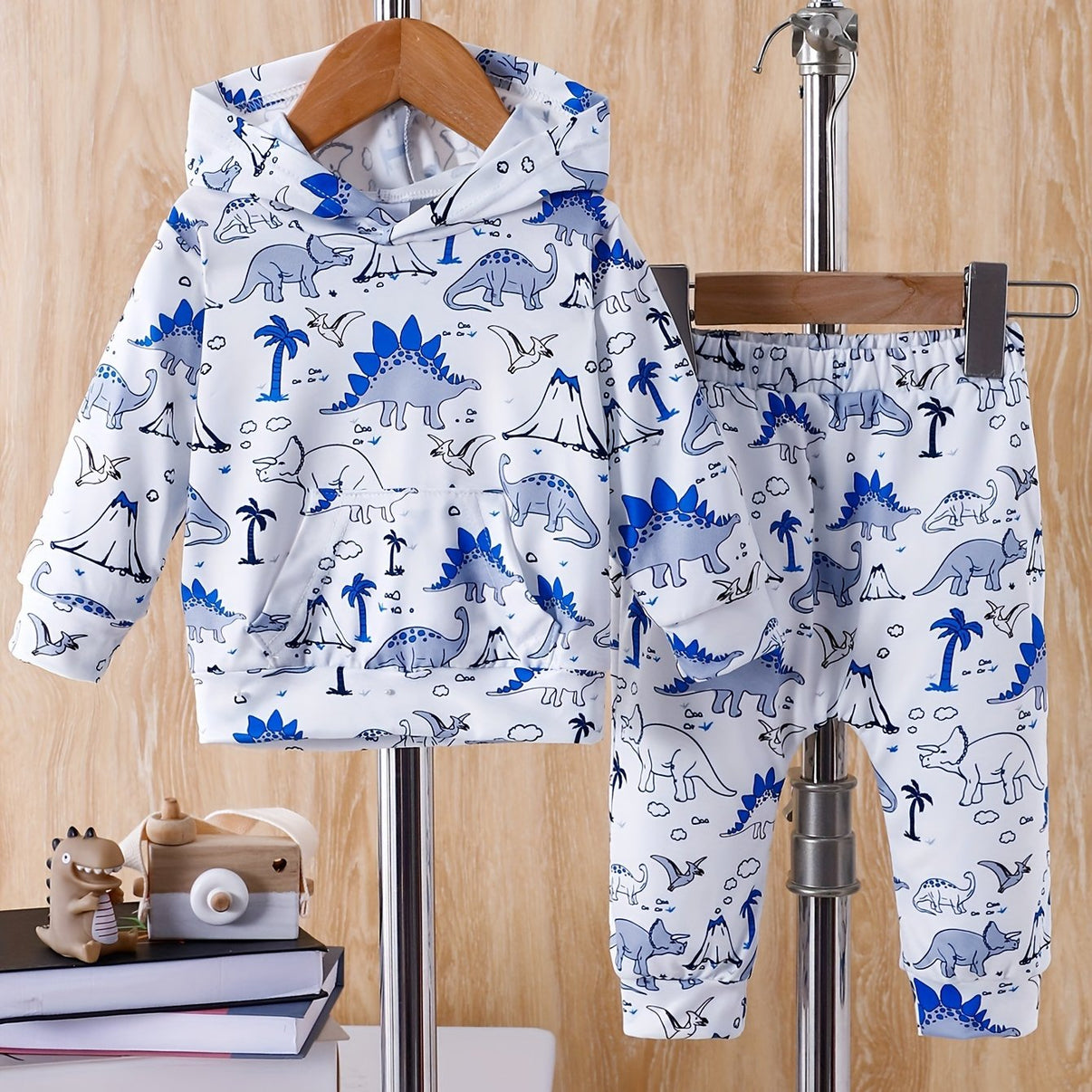 Soft, cozy two-piece set featuring a playful dinosaur print—long sleeve hooded pullover and matching knit pants made from a stretch polyester blend for comfortable everyday wear. Machine washable for easy care and ideal for fall and winter layering.