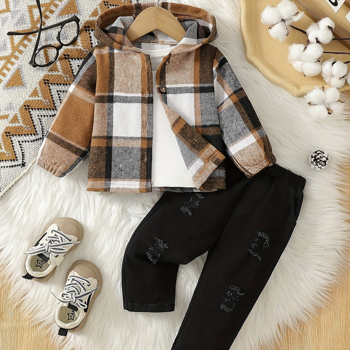 Soft, cozy 2-piece set for baby boys featuring a plaid hooded jacket with button details and a white inner top. Knit polyester construction offers slight stretch and comfortable layering for fall and winter, designed for infants aged 0-3 years.