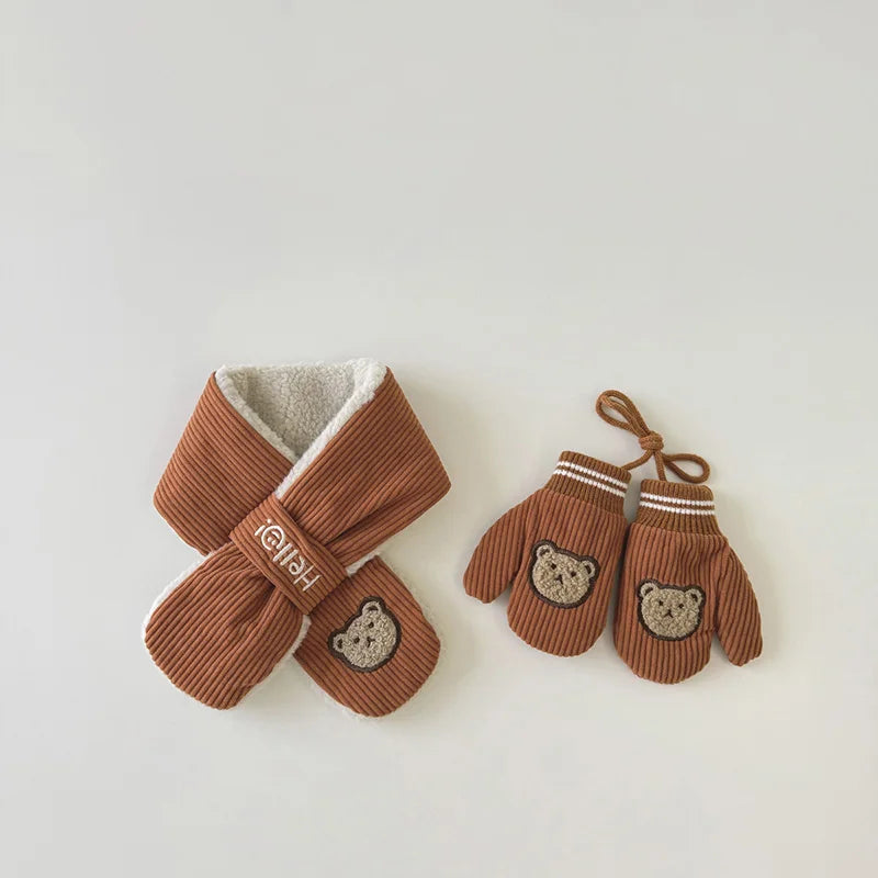 Kids’ Corduroy Winter Scarf & Gloves Set – Thick Velvet Warm Mittens for Boys & Girls