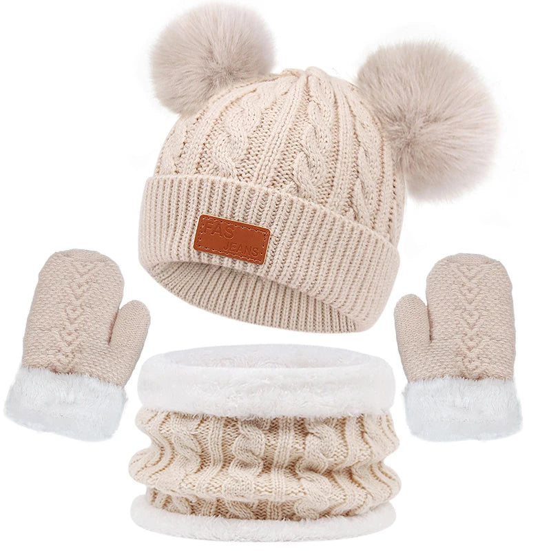 Kids Winter Hat, Scarf & Gloves Set – Double Ball Fleece Lining Baby Beanie Hat for Boys & Girls, Solid Color Knitted Infant Cap (1-4 Years)