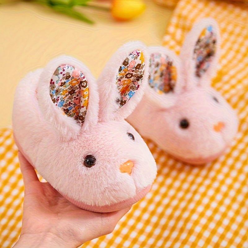 Cozy plush bunny ear slippers for kids and toddlers with soft fleece lining, easy slip-on design and lightweight EVA sole—ideal indoor house shoes for chilly days.